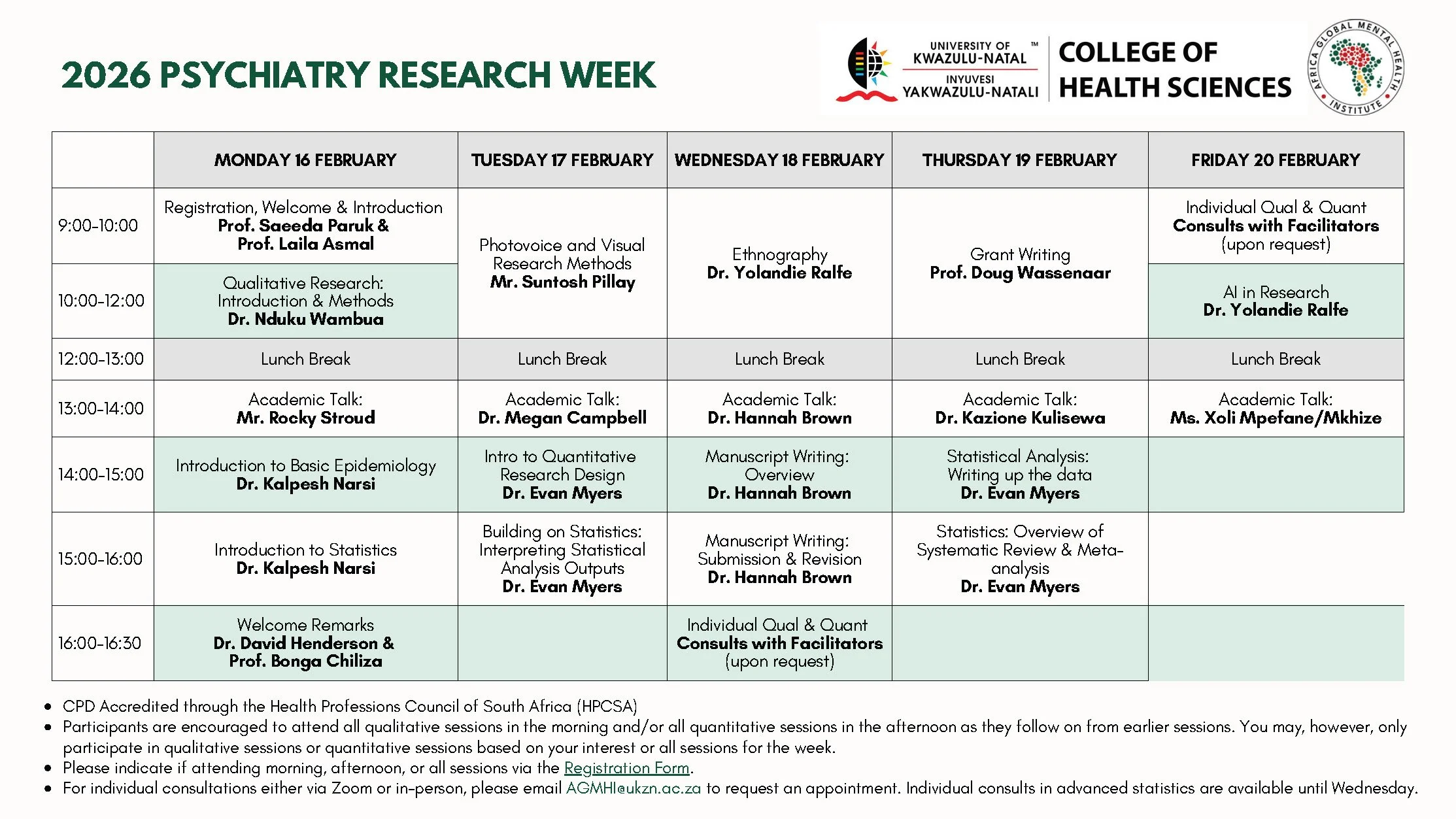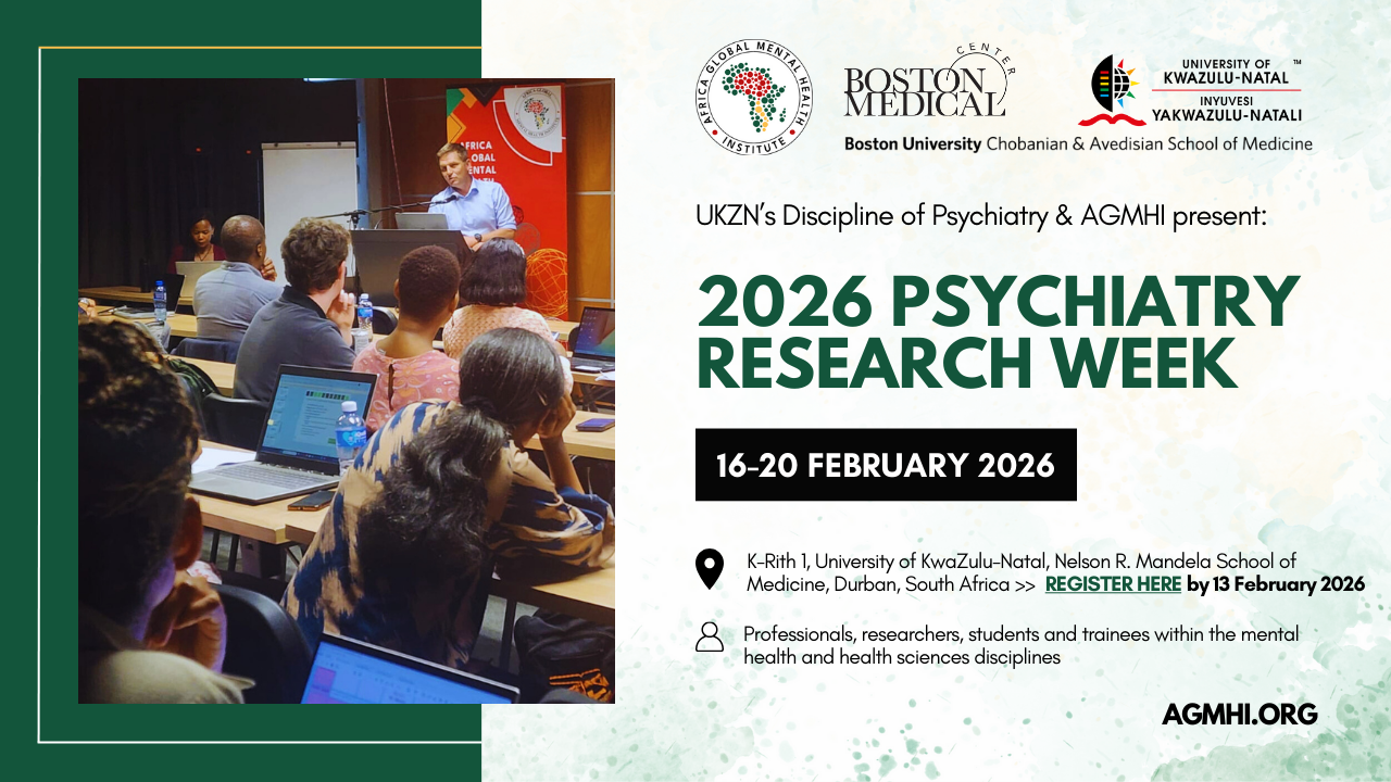 An annual research training week hosted by the University of KwaZulu-Natal (UKZN) Discipline of Psychiatry in partnership with the AGMHI.